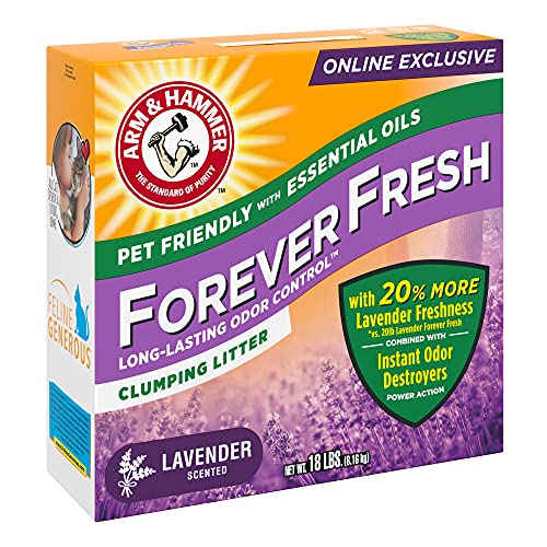 - PET-FRIENDLY WITH ESSENTIAL OILS. Essential oils are the inspiration behind ARM & HAMMER Forever Fresh Lavender Clumping Cat Litter. This lavender-scented clumping cat litter delivers long-lasting freshness that’s pet-friendly yet tough on litter box urine and feces smells, delivering long-lasting odor control. Avoid messy dust clouds and tracks of litter from ARM & HAMMER Forever Fresh Lavender Clumping Cat Litter, thanks to its 99% dust-free formulation. This cat litter forms rock-solid clumps so you can remove the source of odors easily to help maintain litter box freshness. The hard clumps and easy scooping also make this cat litter ideal for multi-cat households.